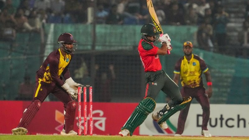 শুরু ও শেষটায় ভালো ব্যাটিং করেছে ওয়েস্ট ইন্ডিজ। ওপেনিং জুটিতে পাওয়া ৫৯ রানের ভিত্তির ওপর দাঁড়িয়ে শেই হোপ ও রোভম্যান পাওয়েল শেষটায় ঝড়ো ব্যাটিং করেন। তাদের ব্যাটে ৩ উইকেট হারিয়ে ১৬৫ রান তোলে ক্যারিবীয়রা। জবাবে পাওয়ার প্লেতে ৪ উইকেট হারানো বাংলাদেশ দুই বল থাকতে ১৪৯ রানে অলআউট হয়েছে। ১৬ রানের হারে তিন ম্যাচের টি-২০ সিরিজ শুরু করেছে। গতকাল সোমবার চট্টগ্রামের বীরশ্রেষ্ঠ ফ্লাইট লেফটেন্যান্ট মতিউর রহমান স্টেডিয়ামে টস জিতে ব্যাটিং নিয়েছিল সফরকারী ওয়েস্ট ইন্ডিজ। ভালো শুরু পাওয়া দলটির ওপেনার আথানজেকে ফিরিয়ে ব্রেক থ্রু দেন লেগ স্পিনার রিশাদ হোসেন। তিনি ২৭ বলে ৩৪ রান করেন। চারটি চার ও একটি ছক্কা মারেন। ইনিংসের ১৩তম ওভারে পরপর ব্রেন্ডন কিং এবং শেরফান রাদারফোর্ডকে তুলে নেন তাসকিন আহমেদ। ওপেনার কিং ৩৬ বলে দুই ছক্কা ও এক চারে ৩৪ রান করেন। তবে তিনে নামা শেই হোপ ২৮ বলে ৪৬ রানের হার না মানা ইনিংস খেলে দলকে এগিয়ে নেন। চারটি ছক্কা ও একটি চার মারেন তিনি। শুরুতে সুবিধা করতে না পারলেও শেষটায় রোভম্যান পাওয়েল ২৮ বলে ৪৪ রানের ইনিংস খেলে পুষিয়ে দেন। তার ব্যাট থেকে চারটি ছক্কা ও একটি চার আসে।জবাবে নেমে বাংলাদেশ ৫.৪ ওভারে ৪১ রানে ৪ উইকেট হারায়। দারুণ শুরু করলে তানজিদ তামিম ৫ বলে ১৫ করে আউট হন। পরেই লিটন দাস (৫) এবং ওপেনার সাইফ হাসান (৮) আউট হন। ভরসা দিতে পারেননি শামীম হোসেনও (১) কিংবা নুরুল হাসান (৫)। একপ্রান্ত ধরে রাখা তাওহীদ হৃদয় দলের ৭৭ রানে ফিরলে জয়ের আশা শেষ হয়। তিনি ২৫ বলে ২৮ রান করেন।তানজিম সাকিব ও নাসুম আহমেদের ছোট ছোট ইনিংসে হারের ব্যবধান কিছুটা ছোট হয়েছে। তানজিম ২৭ বলে দলের পক্ষে সর্বাধিক ৩৩ রানের ইনিংস খেলেন। তিনি তিনটি চার ও একটি ছক্কা মারেন। নাসুম তিন চার ও এক ছক্কায় ১৩ বলে ২০ রান করে ফিরে যান। তাসকিন ১০ ও মুস্তাফিজ ১১ রান করেন। বল হাতে উইকেট না পেলেও বাঁ-হাতি স্পিনার নাসুম আহমেদ ও পেসার মুস্তাফিজ দারুণ বোলিং করেছেন। নাসুম ৪ ওভারে ১৫ ও মুস্তাফিজ ২৪ রান দেন। রিশাদ হোসেন ৪ ওভারে ৪০ রান দিয়ে একটি ও তাসকিন সমান ওভারে ৩৬ রান দিয়ে ২ উইকেট নিয়েছেন। তানজিম সাকিব ৪ ওভারে ৪৭ রান হজম করেছেন। ওয়েস্ট ইন্ডিজের পেসার জেসন হোল্ডার ও জাইডেন সিলস ৪ ওভারে যথাক্রমে ৩১ ও ৩২ রান দিয়ে তিনটি করে উইকেট তুলে নেন। স্পিনার আকিল হোসেন ৪ ওভারে ২২ রান দিয়ে নেন ২ উইকেট।