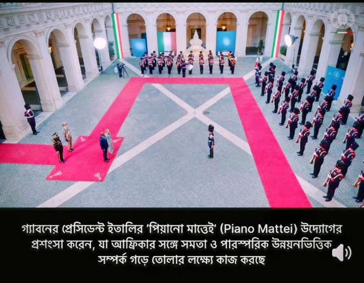 ইতালির প্রধানমন্ত্রী জর্জিয়া মেলোনি আজ গ্যাবনের প্রেসিডেন্ট এনগুয়েমাকে পালাজ্জো কিজিতে আনুষ্ঠানিকভাবে স্বাগত জানান। বৈঠকে দুই নেতা দ্বিপাক্ষিক সম্পর্কের অগ্রগতি ও ভবিষ্যৎ সহযোগিতা নিয়ে আলোচনা করেন।গ্যাবনের প্রেসিডেন্ট ইতালির ‘পিয়ানো মাত্তেই’ (Piano Mattei) উদ্যোগের প্রশংসা করেন, যা আফ্রিকার সঙ্গে সমতা ও পারস্পরিক উন্নয়নভিত্তিক সম্পর্ক গড়ে তোলার লক্ষ্যে কাজ করছে।উভয় পক্ষই জ্বালানি, অবকাঠামো ও স্বাস্থ্যখাতে যৌথ প্রকল্প বাস্তবায়নের মাধ্যমে সহযোগিতা আরও গভীর করার প্রতিশ্রুতি দেন। পিয়ানো মাত্তেই হল ইতালির আফ্রিকা-কেন্দ্রিক নীতি, যা জ্বালানি, শিক্ষা ও বিনিয়োগ সহযোগিতা জোরদার করে। গ্যাবন মধ্য আফ্রিকার একটি গুরুত্বপূর্ণ তেলসমৃদ্ধ দেশ, যার সঙ্গে ইতালির অর্থনৈতিক সম্পর্ক ক্রমশ বাড়ছে।