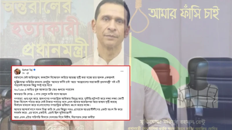 বর্তমানে যেই অগ্নিসন্ত্রাস, ককটেল বিস্ফোরণ করিয়ে আতঙ্ক সৃষ্টি করা হচ্ছে, তার জনক একজনই বলে জানিয়েছেন সাবেক স্বরাষ্ট্র প্রতিমন্ত্রী সোহেল তাজ।গতকাল রোববার মধ্যরাতে সামাজিক যোগাযোগমাধ্যম ফেসবুক তিনি এ কথা বলেন।সোহেল তাজ লিখেছেন, ‘মুক্তিযোদ্ধা মতিউর রহমান রেন্টুর ‘আমার ফাঁসি চাই’ আর ‘অন্তরালের হত্যাকারী প্রধানমন্ত্রী’ বই ২টি পড়লেই অনেক কিছু স্পষ্ট হয়ে যাবে। ইউটিউবে এ অডিও বুক আকারে ফ্রিতেও শুনতে পারবেন।’তিনি লেখেন, ‘ক্ষমতার কি লোভ- ১ লাখ বেলুন নাকি বাসে আগুন।সাবেক স্বরাষ্ট্র প্রতিমন্ত্রী লেখেন, ‘গণহত্যা, গুম/খুন করে, জনগণের গণতান্ত্রিক অধিকার বিলুপ্ত করে, দুর্নীতি/লুটপাট করে লক্ষ্য লক্ষ্য কোটি টাকা বিদেশে পাচার করে, সেই টাকার পাহাড়ে বসে এখন আবার অরাজগতা আর তাণ্ডব সৃষ্টি করছে, নির্বাচন বানচাল করে বাংলাদেশের গণতান্ত্রিক ভবিষ্যৎ ধ্বংস করার লক্ষে।তিনি লেখেন, ‘আমার আশ্চর্য লাগে যখন চিন্তা করি যে, এত কিছুর পরও এদেরকে আওয়ামী লীগের একটা অংশ কি করে সমর্থন করে- এর মানে একটাই- এরাই ছিল সুবিধাভোগী।আর এখন এটার পরিণতি হিসাবে খেসারত দিবে নিরীহ, নিরপরাধ নেতাকর্মীরা।উল্লেখ্য, আওয়ামী লীগ সরকারের আমলে ২০০১ সালের নির্বাচনে গাজীপুর-৪ (কাপাসিয়া) থেকে জাতীয় সংসদ সদস্য নির্বাচিত হন সোহেল তাজ। ২০০৮ সালে একই আসন থেকে পুনরায় সংসদ সদস্য হিসেবে নির্বাচিত হন। ২০০৯ সালের ৬ জানুয়ারি আওয়ামী লীগ নেতৃত্বাধীন মন্ত্রিসভায় স্বরাষ্ট্র প্রতিমন্ত্রীর দায়িত্ব পান সোহেল তাজ।