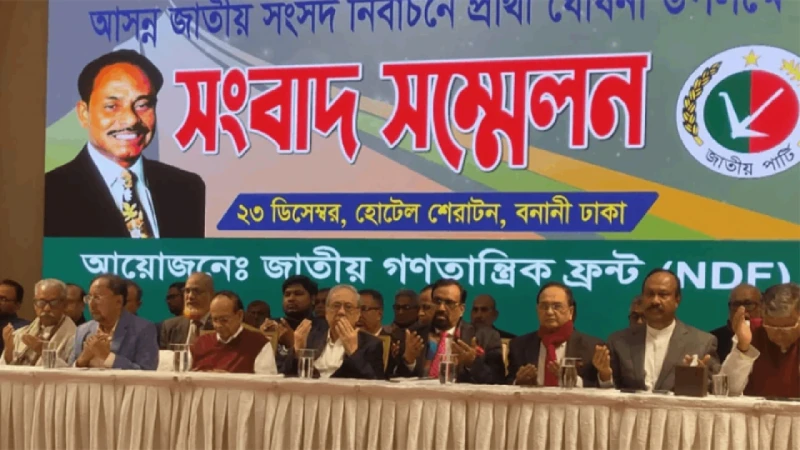 ত্রয়োদশ সংসদ নির্বাচনে অংশগ্রহণের অনিশ্চয়তার মধ্যেই ১১৯ আসনে প্রার্থী ঘোষণা করছে আনোয়ার হোসেন মঞ্জুর জাতীয় পার্টি-জেপি এবং আনিসুল ইসলাম মাহমুদের নেতৃত্বাধীন জাতীয় পার্টির একাংশের নেতৃত্বে গড়া ২০ দলের জোট জাতীয় গণতান্ত্রিক ফ্রন্ট-এনডিএফ।গতকাল মঙ্গলবার (২৩ ডিসেম্বর) সকালে রাজধানীর বনানীর একটি হোটেলে প্রার্থী ঘোষণা উপলক্ষে আয়োজিত সংবাদ সম্মেলনে জাতীয় গণতান্ত্রিক ফ্রন্টের পক্ষ থেকে এ ঘোষণা দেওয়া হয়। সংবাদ সম্মেলনে প্রার্থীদের নাম তালিকা আকারে পড়ে শোনান জাতীয় পার্টির নির্বাহী চেয়ারম্যান মজিবুল হক চুন্নু।নির্বাচনে ১১৯ আসনে ১৩১ জন প্রার্থী ঘোষণা করেছে এনডিএফ। এর মধ্যে কিছু আসনে একাধিক প্রার্থীর নাম ঘোষণা করে জোটটি।(ঝালকাাঠি-২), ডা. সেলিমা খান (ঝালকাঠি-১), সেকান্দার আলী মুকুল বাদশা (পিরোজপুর-৩), মো. আব্দুল হালিম (টাঙ্গাইল-৩), মো. রেজাউল করীম (টাঙ্গাইল-৮), ইদি আমিন এপোলো (ঢাকা-৯), এস এম আমিনুল হক সেলিম (ঢাকা-১১), হাজী নাসির উদ্দিন সরকার (ঢাকা-১২), অ্যাডভোকেট মাসুদুর রহমান মাসুদ (শরিয়তপুর-১), ওয়াহিদুর রহমান ওয়াহিদ (শরিয়তপুর-২), ম. ম ওয়াসিম (শরিয়তপুর-৩), মোখলেসুর রহমান বস্তু (জামালপুর-৪), মো. ইলিয়াস উদ্দিন (শেরপুর-১), জাহাঙ্গির আহমেদ (ময়মনসিংহ-৪), মো. আলমগীর হোসেন (কুমিল্লা-৩), এইচ এম এন শফিকুর রহামন (কুমিল্লা-১১), জাফর আহমেদ রাজু (ফেনী-২), ফজলে এলাহি সোহাগ মিয়া (নোয়াখালী-৩), মো. শামসুল আলম (কক্সবাজার-১), অ্যাডভোকেট মো. তারেক (কক্সবাজার-৩), মো. সাইফুল ইসলাম স্বপন (নোয়াখালী-৫), অ্যাডভোকেট নাসির উদ্দিন বায়জিদ (নোয়াখালী-৬), শেখ মোহা্. ফায়িজ উল্লাহ স্বপন (লক্ষীপুর-২), জহিরুল ইসলাম রেজা (চট্টগ্রাম-২), এম এ সালাম (চট্টগ্রাম-৩), মো. নজরুল ইসলাম (চট্টগ্রাম-৭), এম এ মঞ্জুর মাষ্টার (কক্সবাজার-৪) ও শেখ মোহাম্মদ আলী (ঢাকা-১৮)।