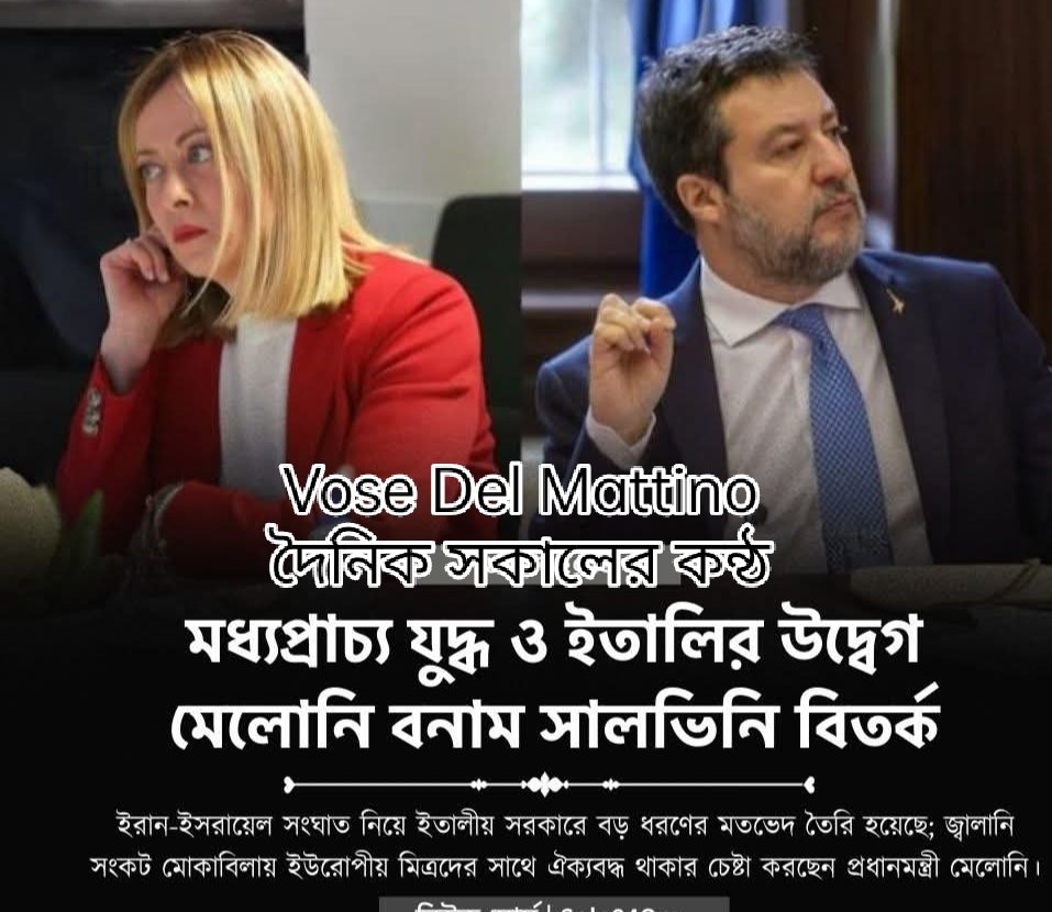 ইরান- যুক্তরাষ্ট ও ইসরায়েল যুদ্ধ ইতালির কূটনৈতিক সতর্কতা ও সামরিক প্রস্তুতি মেলোনি ও উপ-প্রধানমন্ত্রী মাত্তেও সালভিনি বিতর্ক