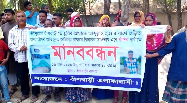 আজ শনিবার ১৬মার্চ ২০২৪ইং সকাল ১০ ঘটিকায় এলাকাবাসী ও বিভিন্ন স্কুলের ছাএ-ছাত্রীরা আব্দুল্লাহ কে ছুরিকাঘাতে হত্যা কারী শহিদুল ইসলাম শহিদ ও তার ছেলে এহসানুল হক সহ উক্ত হত্যার সাথে যারা জড়িতদের সঠিক তদন্ত সাপেক্ষে দোষীদের আইনের আওতায় এনে সর্বোচ্চ শাস্তি ফাঁসির দাবিতে মানববন্ধন করে।