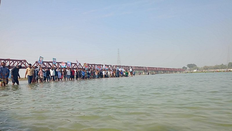 তিস্তা নদীতে নেমে ভারতের পানি আগ্রাসনের প্রতিবাদ জানালেন আন্দোলনকারীরা। তিস্তার পানির ন্যায্য হিস্যার দাবিতে ‘তিস্তা নদী রক্ষা আন্দোলন কমিটি’ প্ল্যাকার্ড প্রদর্শন কর্মসূচির আয়োজন করে। আজ মঙ্গলবার বেলা দেড়টার দিকে লালমনিরহাটের তিস্তা রেলসেতুসংলগ্ন নদীতে নেমে কয়েক হাজার মানুষ এ প্রতিবাদ কর্মসূচি পালন করেন।এ সময় আন্দোলনকারীরা বলেন, ভারত বছরের পর বছর তিস্তা নদীর পানি একতরফাভাবে প্রত্যাহার করেছে যার মাশুল দিচ্ছে বাংলাদেশের পাঁচ জেলার অন্তত দুই কোটি মানুষ। শুষ্ক মৌসুমে এসব এলাকার মানুষ ফসল ফলাতে পারে না। আবার বন্যার সময় হঠাৎ করে পানি ছেড়ে দেওয়ায় ব্যাপক এলাকা ভাঙনের শিকার হয়। প্রায় এক ঘণ্টা আন্দোলনকারীরা পানিতে অবস্থান করেন।প্ল্যাকার্ড প্রদর্শন কর্মসূচিতে উপস্থিত ছিলেন তিস্তা নদী রক্ষা আন্দোলনের প্রধান সমন্বয়কারী ও বিএনপির রংপুর বিভাগীয় সাংগঠনিক সম্পাদক আসাদুল হাবিব (দুলু), সহসাংগঠনিক সম্পাদক আবদুল খালেক, জেলা বিএনপির আহবায়ক সাইফুল ইসলাম প্রমুখ।আসাদুল হাবিব বলেন, ‘বহমান তিস্তার মাঝখানে দাঁড়িয়েছি, কিন্তু পানি নাই। তিস্তা মরুভূমি হয়ে গেছে। গতকাল বিভিন্ন কর্মসূচি ও আজ সকালের পদযাত্রায় আমরা তিস্তার পানির ন্যায্য হিস্যা দাবি করে যাচ্ছি। এখন আমরা তিস্তার পানিতে নেমে বিশ্ববাসীকে দেখাতে চাই, আসলে তিস্তায় কোন পানি নেই। আমরা তিস্তার পানির ন্যায্য হিস্যা চাই। আন্তর্জাতিক নদী আইন অনুযায়ী পানির ন্যায্য হিস্যা দেওয়া হোক।আসাদুল হাবিব আরও বলেন, ‘তিস্তা একসময় এই এলাকার মানুষের ভাগ্য পরিবর্তন করেছে। সেখানে মানুষ ছিন্নমূল হয়েছে, ভিক্ষুকে পরিণত হয়েছে। কর্মহীন মানুষের সংখ্যা দিন দিন রংপুরে বেড়েই যাচ্ছে। দুই কোটি মানুষের জীবনরেখা তিস্তা নদী। এই নদীকে রক্ষা না করা পর্যন্ত আমরা আন্দোলন থেকে সরে যাব না।’