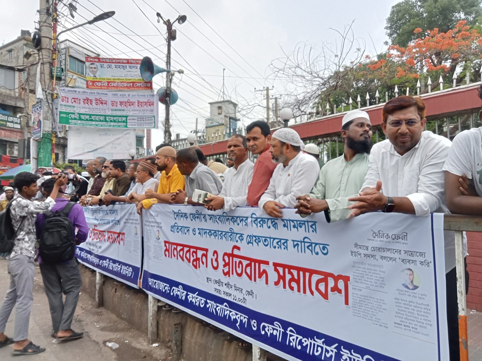 মাদক চোরা কারবারি বিরুদ্ধে প্রতিবেদন প্রকাশের পর মাদক ব্যবসায়ীর মামলার শিকার হন দৈনিক ফেনীর সম্পাদক রিজভী, ঢাকা পোস্টের ফেনী প্রতিনিধ। এই মামলা দায়ের এরপর ফেনীর সাংবাদিক নেতৃবৃন্দ ও রিপোর্টোস ইউনিটি গতকাল ফেনী কেন্দ্রীয় শহীদ মিনারে মানব বন্ধন ও প্রতিবাদ সমাবেশ আয়োজন করে। এতে সভাপতিত্ব করেন ফেনি রিপোর্টার ইউনিটির সভাপতি দৈনিক ফেনীর সময় সম্পাদক সাহাদাত হোসেনের সভাপতিত্বে সঞ্চালনা করেন সময় টিভি আতিয়ার সজল, বক্তব্য রাখেন ছাগলনাইয়া উপজেলা প্রেস ক্লাবের সভাপতি, সাধারণ সম্পাদক, ফুলগাজী উপজেলার প্রেসক্লাবের সাধারণ সম্পাদক , মানবজমিন ফেনী জেলা প্রতিনিধি শামীম আহমেদ বক্তব্য রাখেন, প্রথম আলোর ফেনী জেলা প্রতিনিধি আবু তাহের। তিনি বলেন এই ধরনের মামলা সরকারের আমলে একটি নজিরবিহীন ঘটনা এই ধরনের মামলা দায়ের করেছে চিহ্নিত মাদক কারবারীকে সহযোগিতাকারী আইনজীবীর দিকে প্রশ্ন ছুড়ে দিয়ে, তিনি বলেন ঘটনার বিবরণ না জেনে এই ধরনের মামলা তিনি কি করে করলেন। প্রতিবেদনটি না পড়েই মামলার রুজু করে আইনজীবী সমাজকে হেয় করেছেন। মানববন্ধনে ফেনীতে কর্মরত ইলেকট্রনিক্স মিডিয়া পিন্ট মিডিয়ার সাংবাদিকেরা উপস্থিত ছিলেন। ফেনী থেকে প্রকাশিত দৈনিক পত্রিকা সম্পাদকেরা উপস্থিত ছিলেন। দৈনিক সকালের কন্ঠের সাথে দৈনিক নয়া পয়গামের সম্পাদক সম্পাদক এনাম বলেন তার দীর্ঘ সাংবাদিকতার জীবনে এটি প্রথম ঘটনা, তিনি এ বিষয়ে প্রশাসনের প্রশাসনের দৃষ্টি আকর্ষণ করেন। এতে উপস্থিত ছিলেন দৈনিক ইনকিলাবের জেলা ও ফেনী রিপোর্টেস ইউনিটির যুগ্ম সাধারণ সম্পাদক প্রতিনিধি ওমর ফারুক, সম্পাদক রিজভী, স্টার লাইন জসীমউদ্দীন, দৈনিক সকালে কণ্ঠের সম্পাদক আনোয়ার মোরশেদ মজুমদার (বুলেট) দৈনিক সকালের কন্ঠে সহযোগী সম্পাদক রাজিব সারোয়ার, ফেনীতে কর্মরত সাংবাদিক নেতৃবৃন্দ। ফেনী কর্মরত সাংবাদিকেরা আশা করেন অবিলম্বে এই মামলা প্রত্যাহার করতে হবে এবং এই তারপরে মাদক কারবারি দৃষ্টান্তমূলক শাস্তির আওতায় আনতে হবে। তা না হলে সমাজে মাদক ছেয়ে যাবে। মাদক ব্যবসায়ীদের যৌথ বাহিনী অপারেশনের মাধ্যমে মাদক সম্রাটদেরকে গ্রেফতার করতে হবে। সারা দেশের সাংবাদিকদের নিয়ে বৃহত্তর কর্মসূচি ঘোষণা করবে।