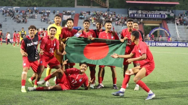 সাফ অনূর্ধ্ব-১৯ চ্যাম্পিয়নশিপের ফাইনালে জায়গা করে নিয়েছে বাংলাদেশ। আজ ভারতের অরুণাচলের ইউপিয়ায় অনুষ্ঠিত প্রথম সেমিফাইনালে নেপালকে ২-১ গোলে হারিয়েছে লাল-সবুজের প্রতিনিধিরা। আগামী ১৮ মে ফাইনালে স্বাগতিক ভারত ও মালদ্বীপের মধ্যকার দ্বিতীয় সেমিফাইনালের জয়ী দলের মুখোমুখি হবে বাংলাদেশ।প্রথমার্ধে গোলশূন্য থাকলেও দ্বিতীয়ার্ধে আসে তিনটি গোল। ম্যাচের ৭৩ মিনিটে অধিনায়ক নাজমুল হুদা ফয়সালের কর্নার থেকে আশিকুর রহমান হেড করে গোল করে দলকে এগিয়ে নেন। এরপর ৮০ মিনিটে ফয়সাল নিজেই স্কোরশিটে নাম লেখান মানিকের পাস থেকে।নেপাল ম্যাচের ৮৬ মিনিটে একটি গোল করে ব্যবধান কমায়। ইনজুরি সময়ে সমতা ফেরাতে চাপ বাড়ালেও বাংলাদেশের রক্ষণভাগ দৃঢ়ভাবে তা প্রতিহত করে।