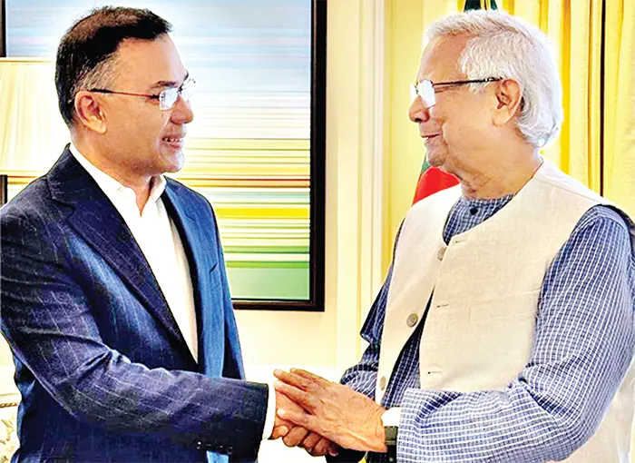 একান্ত বৈঠকের আগে তারেক রহমানের সঙ্গে দলের স্থায়ী কমিটির সদস্য আমীর খসরু মাহমুদ চৌধুরী ও ভারপ্রাপ্ত চেয়ারম্যানের আন্তর্জাতিক বিষয়ক উপদেষ্টা হুমায়ুন কবির এবং প্রধান উপদেষ্টার সঙ্গে জাতীয় নিরাপত্তা উপদেষ্টা ড. খলিলুর রহমান ও প্রেস সচিব শফিকুল আলম উপস্থিত ছিলেন।বৈঠক সংশ্লিষ্ট নির্ভরযোগ্য সূত্র জানায়, আলোচনায় বিএনপি’র ভারপ্রাপ্ত চেয়ারম্যান তারেক রহমান প্রধান উপদেষ্টাকে জানিয়েছেন, নির্বাচনের মাধ্যমে তার দায়িত্ব শেষ হয়ে যাবে না। দেশের প্রয়োজনে তাকে আরও কাজ করতে হবে।গতকাল হওয়া ড. ইউনূস ও তারেক রহমানের মধ্যকার বৈঠকটিতে দৃষ্টি ছিল পুরো দেশের। বৈঠকটি ইতিবাচকভাবে সম্পন্ন হওয়ায় স্বস্তি প্রকাশ করেছে উভয়পক্ষ। সাধারণ মানুষও বৈঠকটি নিয়ে স্বস্তি প্রকাশ করেন।বৈঠক শেষে যৌথ বিবৃতিতে বলা হয়, আগামী বছরের রমজানের আগে জাতীয় নির্বাচন আয়োজনে প্রধান উপদেষ্টা ড. মুহাম্মদ ইউনূসের কাছে প্রস্তাব করেছেন বিএনপি’র ভারপ্রাপ্ত চেয়ারম্যান তারেক রহমান। জবাবে প্রধান উপদেষ্টা জানিয়েছেন সকল প্রস্তুতি সম্পন্ন হলে এই সময়ে নির্বাচন আয়োজন করা যেতে পারে। বিবৃতিতে বলা হয়, শুক্রবার বিএনপি’র ভারপ্রাপ্ত চেয়ারপারসন লন্ডনে সফররত প্রধান উপদেষ্টা প্রফেসর ড. মুহাম্মদ ইউনূসের সঙ্গে সাক্ষাৎ করেন। অত্যন্ত সৌহার্দ্যমূলক পরিবেশে তাদের বৈঠক অনুষ্ঠিত হয়। তারেক রহমান প্রধান উপদেষ্টার কাছে আগামী বছরের রমজানের আগে নির্বাচন আয়োজনের জন্য প্রস্তাব করেন। দলের চেয়ারপারসন বেগম খালেদা জিয়াও মনে করেন, ওই সময় নির্বাচন অনুষ্ঠিত হলে ভালো হয়। প্রধান উপদেষ্টা বলেন যে, তিনি আগামী বছরের এপ্রিলের প্রথমার্ধের মধ্যে নির্বাচন অনুষ্ঠানের ঘোষণা দিয়েছেন। সকল প্রস্তুতি সম্পন্ন করা গেলে ২০২৬ সালের রমজান শুরু হওয়ার আগের সপ্তাহেও নির্বাচন আয়োজন করা যেতে পারে। সেক্ষেত্রে সেই সময়ের মধ্যে সংস্কার ও বিচারের বিষয়ে পর্যাপ্ত অগ্রগতি অর্জন করা প্রয়োজন হবে। বিবৃতিতে আরও বলা হয়, তারেক রহমান প্রধান উপদেষ্টার এই অবস্থানকে স্বাগত জানান এবং দলের পক্ষ থেকে তাকে ধন্যবাদ জ্ঞাপন করেন। প্রধান উপদেষ্টাও তারেক রহমানকে ফলপ্রসূ আলোচনার জন্য ধন্যবাদ জানান। যৌথ বিবৃতি পড়ে শোনার পর সাংবাদিকদের কয়েকটি প্রশ্নের উত্তর দেন জাতীয় নিরাপত্তা উপদেষ্টা ও বিএনপি’র স্থায়ী কমিটির সদস্য আমীর খসরু মাহমুদ চৌধুরী। জুলাই সনদ নিয়ে একজন সাংবাদিক প্রশ্ন করলে আমীর খসরু মাহমুদ চৌধুরী বলেন, জুলাই সনদ নিয়ে অলরেডি আলোচনা চলছে দেশে। এ ব্যাপারে আমাদের মধ্যে অলরেডি সিদ্ধান্ত আছে যে ঐকমত্যের ভিত্তিতে তা হোক। সংস্কার নিয়েও একই জবাব আমাকে দিতে হবে।তিনি বলেন, ঐকমত্য যেখানে হবে, স্বাভাবিকভ