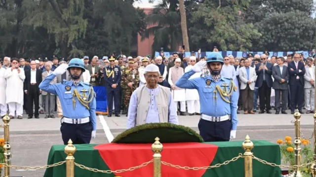 মহান মুক্তিযুদ্ধের ডেপুটি চিফ অব স্টাফ ও স্বাধীন বাংলাদেশের প্রথম বিমান বাহিনী প্রধান এয়ার ভাইস মার্শাল (অব.) আবদুল করিম খন্দকারের (এ কে খন্দকার) নামাজে জানাজায় অংশ নিয়েছেন প্রধান উপদেষ্টা অধ্যাপক মুহাম্মদ ইউনূস।রোববার (২১ ডিসেম্বর) রাজধানীর বিমান বাহিনী ঘাঁটি বাশারে এ কে খন্দকারের জানাজা অনুষ্ঠিত হয়। জানাজার আগে রাষ্ট্রীয় মর্যাদায় বীর মুক্তিযোদ্ধা এ কে খন্দকারের বিদায় প্যারেড অনুষ্ঠিত হয়।জানাজায় অন্তর্বর্তী সরকারের উপদেষ্টারা ছাড়াও সেনা, নৌ ও বিমান বাহিনীর প্রধানসহ উচ্চপদস্থ সামরিক ও বেসামরিক কর্মকর্তারা অংশ নেন।জানাজা শেষে রাষ্ট্রপতির পক্ষে তার সামরিক সচিব মরহুম এ কে খন্দকারের কফিনে পুষ্পস্তবক অর্পণ করে শ্রদ্ধা জানান। এরপর প্রধান উপদেষ্টা অধ্যাপক মুহাম্মদ ইউনূস কফিনে পুষ্পস্তবক অর্পণ করে শেষ শ্রদ্ধা নিবেদন করেন।পরে মুক্তিযুদ্ধবিষয়ক উপদেষ্টা ফারুক-ই-আজম, সেনাবাহিনী প্রধান জেনারেল ওয়াকার-উজ-জামান, নৌবাহিনী প্রধান অ্যাডমিরাল এম নাজমুল হাসান এবং বিমানবাহিনী প্রধান এয়ার চিফ মার্শাল হাসান মাহমুদ খাঁন একে একে পুষ্পস্তবক অর্পণ করেন। পরে বিমানবাহিনীর একটি ফ্লাই পাস্টের মাধ্যমে মরহুম এ কে খন্দকারের প্রতি সম্মান জানানো হয়।জানাজার আগে এ কে খন্দকারের ছেলে জাফরুল করিম খন্দকার সংক্ষিপ্ত বক্তব্য দেন।মুক্তিযুদ্ধের অন্যতম বীর সেনানী এ কে খন্দকার শনিবার সকালে বার্ধক্যজনিত কারণে মারা যান। তিনি ছিলেন মুক্তিযুদ্ধের অন্যতম সংগঠক, বীর-উত্তম খেতাবপ্রাপ্ত বীর মুক্তিযোদ্ধা, মুক্তিবাহিনীর ডেপুটি চিফ অব স্টাফ, স্বাধীন বাংলাদেশের প্রথম বিমান বাহিনী প্রধান এবং সাবেক মন্ত্রী।১৯৭১ সালের মহান মুক্তিযুদ্ধে সাহসিকতা, দূরদর্শিতা ও নেতৃত্বগুণের মাধ্যমে দেশের স্বাধীনতা অর্জনে গুরুত্বপূর্ণ ভূমিকা রাখেন এ কে খন্দকার। মুক্তিযুদ্ধকালীন সময়ে তার কৌশলগত সিদ্ধান্ত ও সাংগঠনিক দক্ষতা স্বাধীনতার সংগ্রামকে আরও সুসংহত করে