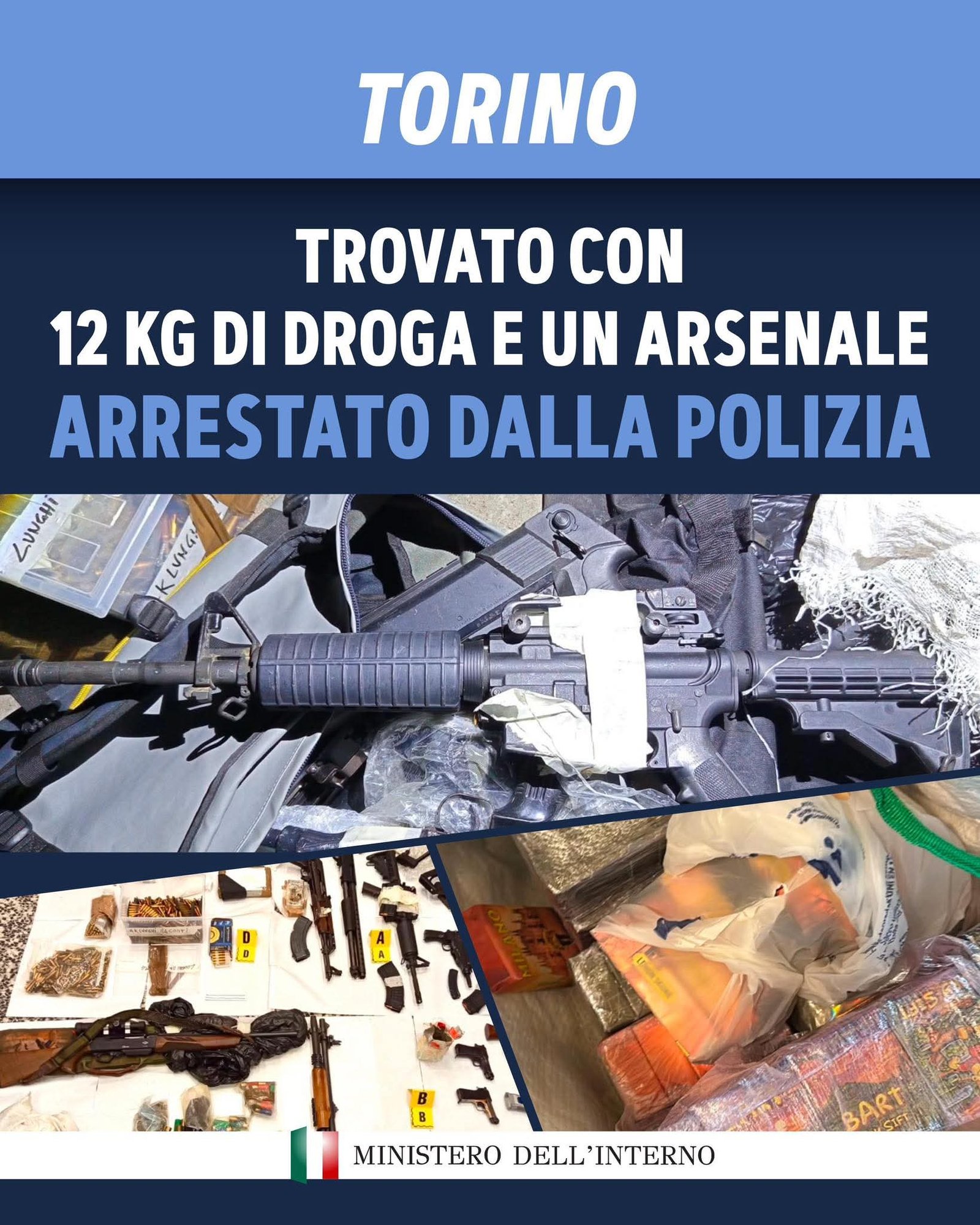 তুরিন, ইতালি: ইতালির তুরিন শহরের রেজিও পার্কো এলাকায় এক শ্বাসরুদ্ধকর অভিযান চালিয়ে বিপুল পরিমাণ মাদক এবং বিপজ্জনক যুদ্ধাস্ত্রের ভাণ্ডার উদ্ধার করেছে রাজ্য পুলিশ। এই ঘটনায় ৪৯ বছর বয়সী এক ব্যক্তিকে গ্রেপ্তার করা হয়েছে।উদ্ধারকৃত মাদকের বিবরণতল্লাশিতে পুলিশ মোট ১২ কেজি মাদক জব্দ করেছে। এর মধ্যে রয়েছে:কোকেন,হাশিশ গাঁজা, উদ্ধারকৃত অস্ত্রাগার মাদকের পাশাপাশি ওই ব্যক্তির কাছে পাওয়া গেছে আধুনিক সব মারণাস্ত্র, যা দেখে খোদ পুলিশ কর্মকর্তারাও বিস্মিত। জব্দ করা অস্ত্রের তালিকায় রয়েছে:রাইফেল ও পিস্তল,মেশিনগান ১,৮০০ রাউন্ডেরও বেশি গোলাবারুদ ও ম্যাগাজিন বুলেটপ্রুফ জ্যাকেট এমনকি একটি সচল হ্যান্ড গ্রেনেড অপরাধীদের আইনি ব্যবস্থা