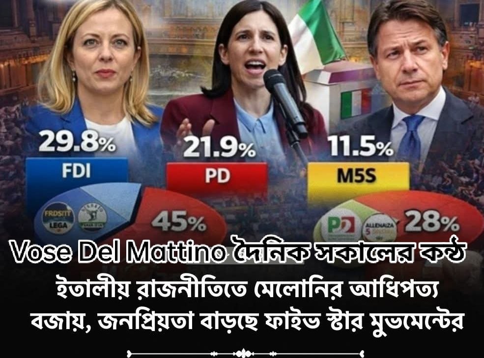 রোম, ২০ মার্চ ২০২৬: ইতালির রাজনৈতিক অঙ্গনে প্রধানমন্ত্রী জর্জিয়া মেলোনির জনপ্রিয়তায় কোনো ভাটা পড়েনি। সাম্প্রতিক এক জনমত জরিপে দেখা গেছে, মেলোনির দল ‘ফ্রাতেল্লি দ’ইতালিয়া’ (FdI) ২৯.৪ শতাংশ জনসমর্থন নিয়ে দেশের এক নম্বর রাজনৈতিক শক্তি হিসেবে নিজের অবস্থান আরও সুসংহত করেছে।বিরোধী শিবিরের হালচাল গত ১৭ মার্চ সংবাদমাধ্যম ‘টিজি লা-সেভেন’ (Tg La7)-এর জন্য পরিচালিত এই জরিপে দেখা যায়:ডেমোক্রেটিক পার্টি (PD): প্রধান বিরোধী দলটির জনসমর্থন সামান্য কমে বর্তমানে ২১.৭ শতাংশে দাঁড়িয়েছে।ফাইভ স্টার মুভমেন্ট (M5S): জুসেপ্পে কন্তের নেতৃত্বাধীন এই দলটি এবারের জরিপে চমক দেখিয়েছে। ০.৩ শতাংশ পয়েন্ট বেড়ে তাদের সমর্থন দাঁড়িয়েছে ১২.৩ শতাংশে, যা এই জরিপের সবচেয়ে উল্লেখযোগ্য পরিবর্তন।অ্যালিয়ানজা ভার্দি এ সিনিস্ত্রা (AVS): বামপন্থী এই জোটের জনপ্রিয়তা ০.২ শতাংশ কমে বর্তমানে ৬.৬ শতাংশে নেমেছে।ক্ষমতাসীন জোটের শরিকদের অবস্থা মেলোনির দল শক্তিশালী অবস্থানে থাকলেও তার জোটের অন্য শরিকদের জনপ্রিয়তায় সামান্য ধস লক্ষ্য করা গেছে।ফরজা ইতালি: দলটির সমর্থন বর্তমানে ৮ শতাংশ।লেগা: মাত্তেও সালভিনির নেতৃত্বাধীন এই দলটির সমর্থন কমে দাঁড়িয়েছে ৬.৬ শতাংশে।উভয় দলই গত জরিপের তুলনায় ০.২ শতাংশ পয়েন্ট হারিয়েছে। ২০২৬ সালের মার্চের এই জরিপটি ইতালীয় ভোটারদের রাজনৈতিক মনোভাবের একটি স্থিতিশীল চিত্র তুলে ধরেছে। জোটের শরিকদের সমর্থন কিছুটা কমলেও মেলোনির ব্যক্তিগত জনপ্রিয়তা ও দলের শক্তিশালী অবস্থান তাকে ইতালির রাজনীতিতে অপ্রতিরোধ্য করে রেখেছে।