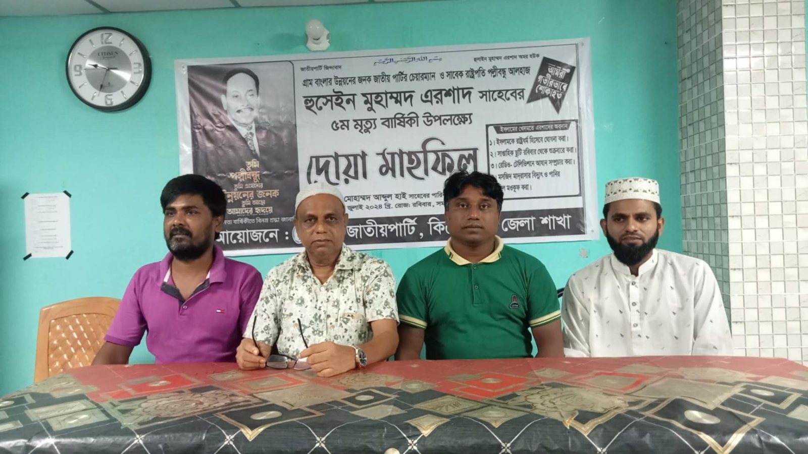 জাতীয় পার্টির চেয়ারম্যান সাবেক রাষ্ট্রপতি হুসাইন মোহাম্মদ এরশাদ-এর ৫ম মৃত্যুবার্ষিকী উপলক্ষ্যে তার রুহের মাগফেরাত কামনায় দোয়া মাহফিল করেছে কিশোরগঞ্জ জেলা জাতীয় পার্টির নেতাকর্মীরা।রবিবার (১৪ জুলাই) রাতে জেলা জাতীয় পার্টির সভাপতি ডাক্তার মোঃ আব্দুল হাইয়ের বাসভবনে এ দোয়া মাহফিল অনুষ্ঠিত হয়।দোয়া মাহফিলের আগে সংক্ষিপ্ত আলোচনায় সাবেক রাষ্ট্রপতি ও জাতীয় পার্টির প্রতিষ্ঠাতা চেয়ারম্যান হুসাইন মোহাম্মদ এরশাদের সারা বাংলাদেশে উন্নয়নের স্মৃতিচারণ করেন