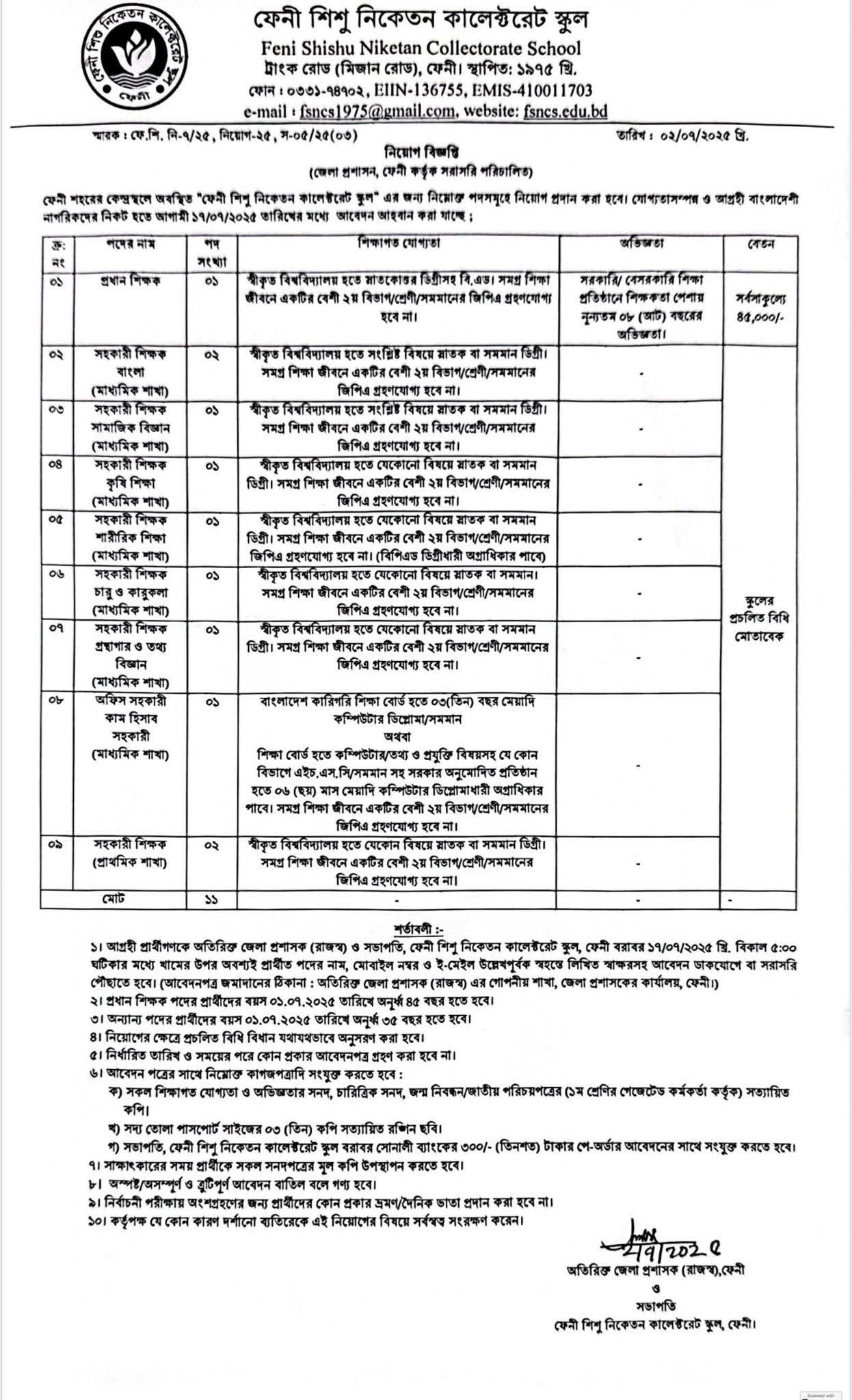 শূন্য পদে ফেনী ফেনী শিশু নিকেতন কালেক্টরেট স্কুলে নিয়োগ