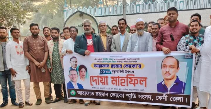 ফেনী তাকিয়া মসজিদে আরাফাত রহমান কোকো স্মৃতি সংসদে আয়োজন বিএনপির প্রতিষ্ঠাতা প্রেসিডেন্ট জিয়া পুত্র ক্রীড়া অনুরাগী আরাফাত রহমান কোকো মৃত্যু বার্ষিকী উপলক্ষে আলোচনা ও মিলাদ দোয়া মাহফিলের আয়োজন করে। এতে আলোচনা করেন ফেনী জেলা বিএনপি র যুগ্ম আহবায়ক গাজী হাবিবউল্লাহ মানিক বলেন বাংলাদেশ ক্রীড়া অনুরাগীদের মধ্যে আরাফাত রহমান কোকো ছিলেন অন্যতম। প্রসিডেন্ট জিয়া ও তিন বারে প্রধানমন্ত্রী বেগম খালেদা জিয়ার সন্তান হয়েও সাধারণত জীবন জাপন করতেন। তার চিন্তা ছিলো ক্রীড়া জগত নিয়ে। আরাফাত হমান কোকোর মৃত্যুেতে ক্রীড়া জগত অভিভাবক হারিয়েছে। । এতে ফেনী জেলা আরাফাত রহমান কোকো স্মৃতি সংসদদের সভাপতি ও সাধারণ সম্পাদক সহ ছাত্রদল যুবদলের নেতা উপস্থিত ছিলেন। ফেনী জেলা বিএনপি সিনিয়র নেতা ইয়াকুব নবী দোয়া ও আলোচনা উপস্থিত ছিলেন। তাকিয়া মসজিদে ইমাম মোনাজাত পরিচালনা করেন।
