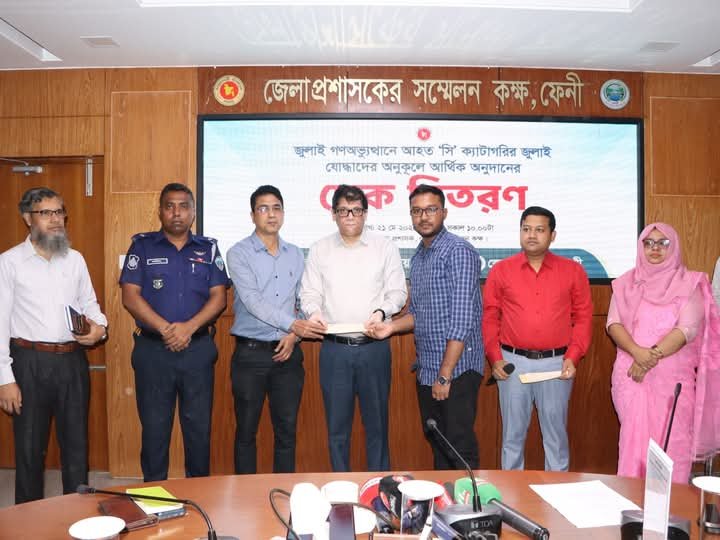 ফেনীতে ‘সি’ ক্যাটাগরির জুলাই যোদ্ধাদের মাঝে এককালীন আর্থিক সহায়তা হিসেবে এক লাখ টাকার চেক বিতরণ করা হয়েছে। আজ বুধবার (২২ মে) সকালে ফেনী জেলা প্রশাসকের কার্যালয়ে আয়োজিত এই আনুষ্ঠানিক অনুষ্ঠানে চেক বিতরণ কার্যক্রম সম্পন্ন হয়।