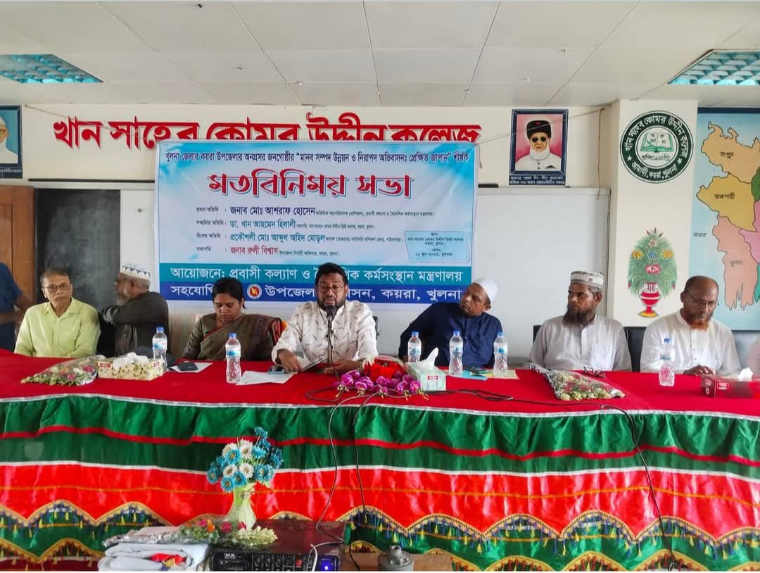 কয়রায় প্রবাসীকল্যাণ ও বৈদেশিক কর্মসংস্থান মন্ত্রণালয়ের অধীনে জনশক্তি কর্মসংস্থান ও প্রশিক্ষণ ব্যুরো (বিএমইটি) এর উদ্যোগে উপজেলা প্রশাসনের আয়োজনে”মানব সম্পদ উন্নয়ন ও নিরাপদ অভিবাসন প্রেক্ষিত জাপান” শীর্ষক এক মতবিনিময় সভা অনুষ্ঠিত হয়েছে।আজ বুধবার বেলা ১১টায় কয়রা উপজেলার আমাদি ইউনিয়নের খাঁন সাহেব কোমর উদ্দীন ডিগ্রি কলেজের মিলনায়তন কক্ষে উপজেলা নির্বাহী অফিসার রুলী বিশ্বাসের সভাপতিত্বে অনুষ্ঠিত হয়। প্রধান অতিথি হিসেবে উপস্থিত ছিলেন বিএমইটির অতিরিক্ত মহাপরিচালক (যুগ্ম সচিব) মোঃ আশরাফ হোসেন।