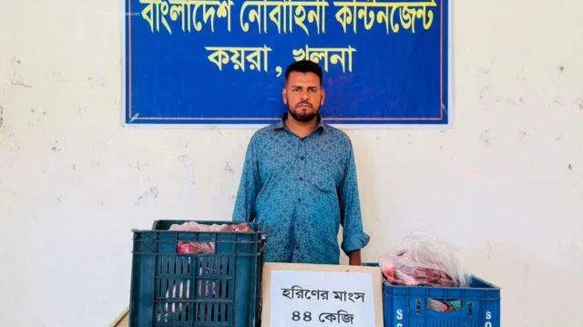 খুলনার কয়রা উপজেলায় পুলিশ ও নৌবাহিনীর যৌথ অভিযানে ৪৪ কেজি হরিণের মাংসসহ সেলিম হাওলাদার নামের এক ব্যক্তিকে আটক করা হয়েছে।সেলিম কয়রা এলাকার মৃত এইচ এম শওকত হোসেনের ছেলে।পুলিশ জানায়, গোপন সংবাদের ভিত্তিতে কয়রা উপজেলার কয়রা গ্রামে অভিযান চালিয়ে সেলিম হাওলাদারের বাড়ির ফ্রিজ থেকে ৪৪ কেজি হরিণের মাংসসহ তাকে আটক করে যৌথ বাহিনী।কয়রা থানার উপপরিদর্শক তারিক মাহমুদ বলেন, এ বিষয়ে কয়রা থানায় মামলা হয়েছে।