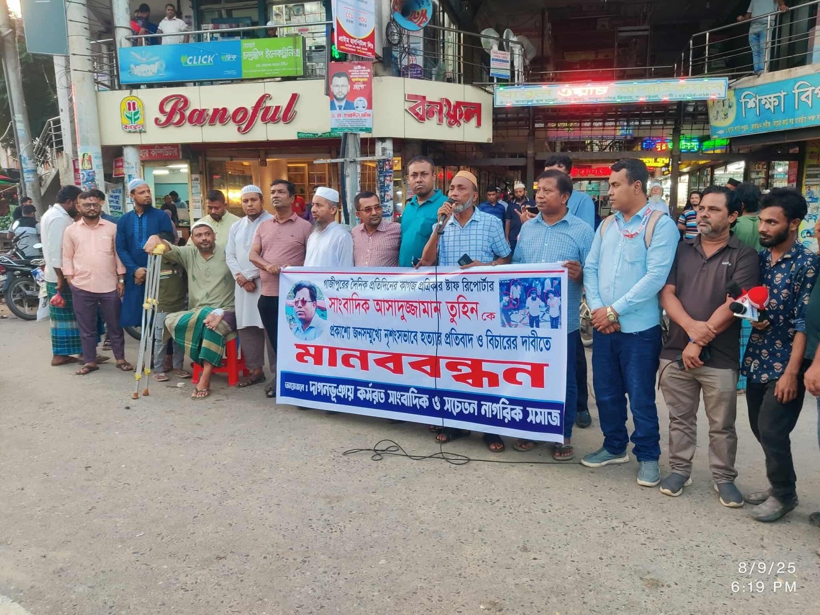 দাগনভুইয়া প্রতিনিধি :দৈনিক প্রতিদিনের কাগজ পত্রিকার স্টাফ রির্পোটার আসাদুজ্জামান তুহিন হত্যার প্রতিবাদে আজ দাগনভুইয়া বাজারে মানববন্ধন কর্মসূচি পালন করা হয়েছে। দাগনভুইয়া প্রেসক্লাবের সভাপতি মোঃ ইমাম হাছান কচির সভাপতিত্বে ও সাংবাদিক আবদুল্লাহ আল মামুনের সঞ্চালনায় সভায় বক্তব্য রাখেন, রির্পোটার্স ক্লাবের সভাপতি ইন্জিয়ার মোকারর হোসেন, প্রেসক্লাবের সাধারন সম্পাদক তবারক হোসেন, সাংবাদিক মোয়াজ্জেম হোসেন, ফখরুল ইসলাম,আলা উদ্দিন আল হাসান,শাহ আলম, উপজেলা জামায়াতের আমীর মাওলানা গাজী সালাউদ্দীন, সেক্রেটারি কামাল উদ্দিন, জাসদের সভাপতি তাজ উদ্দিন আজাদ, ইসলামী আন্দোলনের সভাপতি মিরাজ,সাবেক কাউন্সিলর ও বিএনপি নেতা গিয়াসউদ্দিন, বাসদের সিরাজ উল্যাহ, জেলা ছাত্র দলের নেতা কাজী জামশেদুর রহমান ফটিক, পৌর বিএনপির সাধারণ সম্পাদক কাজী সাইফুর রহমান স্বপন প্রমুখ।