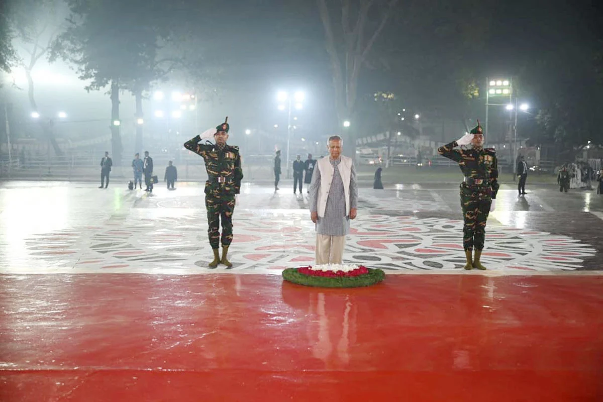 একুশে ফেব্রুয়ারির প্রথম প্রহরে কেন্দ্রীয় শহীদ মিনারে ভাষা শহীদদের প্রতি শ্রদ্ধা জানিয়েছেন প্রধান উপদেষ্টা অধ্যাপক ড. মুহাম্মদ ইউনূস।রাত ১২টা ১ মিনিটে প্রথমে রাষ্ট্রপতি কেন্দ্রীয় শহীদ মিনারে পুষ্পস্তবক অর্পণ করেন। এরপর পুষ্পস্তবক অর্পণ করে শ্রদ্ধা নিবেদন করেন প্রধান উপদেষ্টা। তারা ভাষা বীরদের স্মৃতির প্রতি গভীর শ্রদ্ধা জানিয়ে কিছুক্ষণ নীরবে দাঁড়িয়ে থাকেন।ঘড়ির কাঁটা রাত ১২টা বাজার কয়েক মিনিট আগে কেন্দ্রীয় শহীদ মিনারে পৌঁছান তারা।এ ছাড়া এর আগে রাত ১১টা থেকেই আন্তর্জাতিক মাতৃভাষা দিবসের প্রথম প্রহরে কেন্দ্রীয় শহীদ মিনারে শ্রদ্ধা নিবেদনের জন্য পলাশী প্রান্তে অপেক্ষা করতে থাকেন বিভিন্ন শ্রেণিপেশার মানুষ।