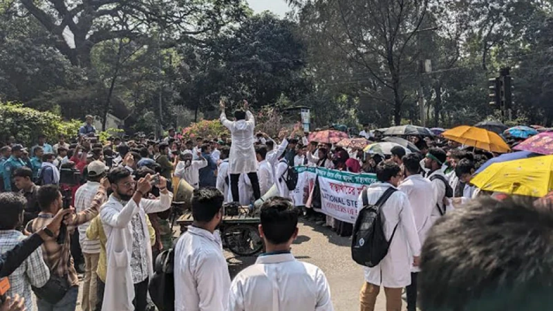 পুলিশের বাধায় চিকিৎসক ও মেডিকেল শিক্ষার্থীদের স্বাস্থ্য মন্ত্রণালয় অভিমুখে পদযাত্রা কর্মসূচি পুলিশ আটকে দেওয়ার পর তাদের ১৫ সদস্যদের প্রতিনিধিদল সচিবালয়ে গেছে। প্রতিনিধিদলের নেতৃত্ব দিচ্ছেন ডক্টরস মুভমেন্ট ফর জাস্টিস নামে চিকিৎসকদের একটি সংগঠনের সাংগঠনিক সম্পাদক ডা. মো. হাবিবুর রহমান সোহাগ।আজ বুধবার দুপুরে সংবাদমাধ্যমকে ডক্টরস মুভমেন্ট ফর জাস্টিসের সভাপতি ডা. জাবির হোসেন বলেন, ‘চিকিৎসকদের বাকি ৪ দফা দাবি আদায়ে স্বাস্থ্য মন্ত্রণালয় অভিমুখে আমরা পদযাত্রা শুরু করেছিলাম, কিন্তু সেটি হাইকোর্ট মোড় হয়ে শিক্ষাভবনের সামনে পুলিশের ব্যারিকেডে আটকে দেওয়া হয়।ডা. জাবির হোসেন বলেন, ‘সেখানে সব চিকিৎসক-মেডিকেল শিক্ষার্থীরা অবস্থান করলেও আমাদের ১৫ সদস্যের একটি প্রতিনিধিদল স্বাস্থ্য মন্ত্রণালয় গেছে। সেখানে স্বাস্থ্য উপদেষ্টা এবং প্রধান উপদেষ্টার বিশেষ সহকারী ডা. সায়েদুর রহমানের সঙ্গে আলোচনা শেষে পরবর্তী পরিকল্পনা জানানো হবে।উল্লেখ্য, আজ বেলা ১১টায় মেডিকেল কলেজের শিক্ষার্থীরা কেন্দ্রীয় শহীদ মিনার জড়ো হন। তাদের সঙ্গে ইন্টার্ন ডাক্তার ও মেডিকেল কলেজের শিক্ষকরা যোগ দেন। শহীদ মিনার থেকে দুপুর ১টা ১৫ মিনিটে তারা পদযাত্রা শুরু করেন। দুপুর ১টা ৩৫ মিনিটে তাদের পদযাত্রা হাইকোর্ট মোড়ে আটকে দেয় পুলিশ আন্দোলনকারীরা যে পাঁচ দফা দাবি জানিয়েছেন এর মধ্যে এমবিবিএস ও বিডিএস ডিগ্রি ছাড়া কেউ নামের আগে ডাক্তার পদবি লিখতে পারবে না বলে ইতোমধ্যে হাইকোর্ট রায় দিয়েছেন। বাকি চার দাবির সুরাহা চেয়ে তারা মন্ত্রণালয়ে যাচ্ছেন।