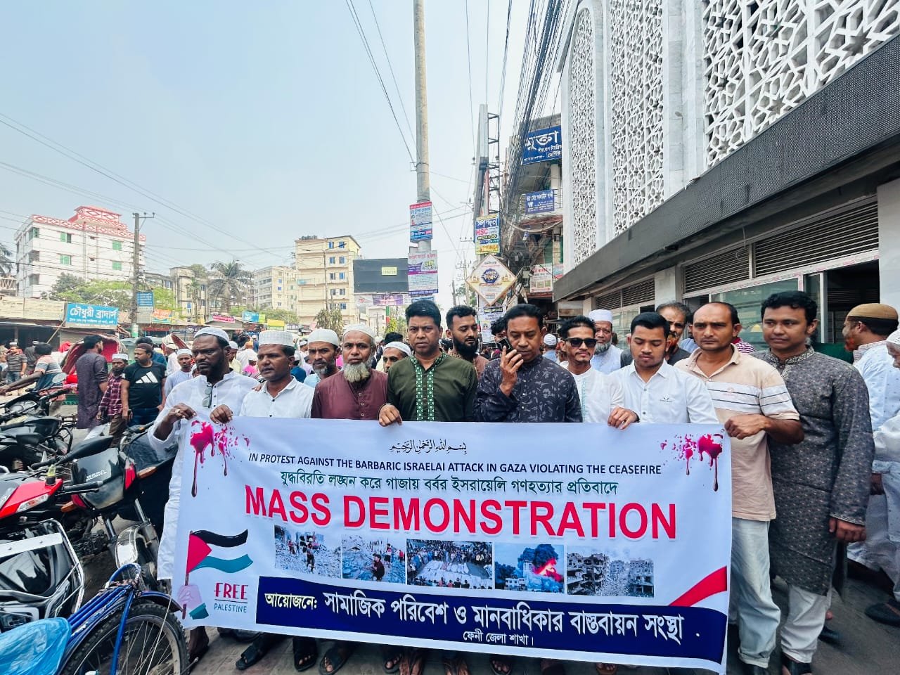আজ শুক্রবার বাদ জুম্মা সামাজিক পরিবেশ ও মানবাধিকার বাস্তবায়ন সংস্থা ফেনী জেলা শাখার উদ্যোগে যুদ্ধ বিরতি আইন অমান্য করে ফিলিস্তিনি মুসলমানদের উপর ন্যাক্কার জনক হামলার প্রতিবাদে ফেনী বড় মসজিদ প্রাঙ্গন থেকে প্রেসক্লাব অভিমুখে বিক্ষোভ ও মানববন্ধন অনুষ্ঠিত হয় । এতে সভাপতিত্ব করেন মোঃ ফেরদৌস কোরাইশী, বক্তব্য রাখেন মীর নিজাম উদ্দিন সংগঠন সহ-সভাপতি সাইফুল ইসলাম সহ-সভাপতি জাহাঙ্গীর আলম, সাধারণ সম্পাদক সংগঠন সকল সদস্য ও সাধারণত জনগন বিক্ষোভ মিছিল অংশগ্রহণ করে। সমাবেশ উপস্থিত ছিলেন লোকমান শেখ, নির্বাহী সদস্য রুহুল আমিন, নির্বাহী সদস্য সাহেদ আলম, দপ্তর সম্পাদক ইমাম হাসান আরমান, নির্বাহী সদস্য দৈনিক সকালেরকন্ঠের বিশেষ প্রতিনিধি আবু সাইদ, নোমান বাবু সহ প্রমুখ নেতৃবৃন্দ উপস্থিত ছিলেন।