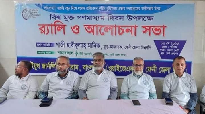 ‘সাহসী নতুন বিশ্বে সংবাদ প্রতিবেদন—কৃত্রিম বুদ্ধিমত্তার প্রভাব গণমাধ্যমের স্বাধীনতার ওপর’ এই প্রতিপাদ্যে বিশ্ব মুক্ত গণমাধ্যম দিবস উপলক্ষে ফেনীতে র্যালি ও আলোচনা সভা অনুষ্ঠিত।শনিবার (৩ মে, ২০২৫) সকালে ফেনী প্রেসক্লাব মিলনায়তনে এ অনুষ্ঠানের আয়োজন করে ইয়ুথ জার্নালিস্ট ফোরাম বাংলাদেশ (ওয়াইজেএফবি), ফেনী জেলা শাখা।ওয়াইজেএফবি ফেনী জেলার সভাপতি শাহজালাল ভূঞার সভাপতিত্বে ও সাধারণ সম্পাদক সোলায়মান হাজারী ডালিমের সঞ্চালনায় অনুষ্ঠানে প্রধান অতিথি ছিলেন, ফেনী জেলা বিএনপির যুগ্ম আহ্বায়ক গাজী হাবীবুল্যাহ মানিক।বিশেষ অতিথি হিসেবে উপস্থিত ছিলেন, ফেনী রিপোর্টার্স ইউনিটির সভাপতি শাহাদাত হোসেন, ফেনী প্রেস ক্লাবের সাবেক সভাপতি এ. কে. এম. আবদুর রহিম ও মুহাম্মদ আবু তাহের ভূঁইয়া, দৈনিক স্টার লাইনের নির্বাহী সম্পাদক মাঈন উদ্দিন এবং কানাডা বিএনপির যুগ্ম সম্পাদক হুমায়ুন পাটোয়ারী।অনুষ্ঠানে আরও বক্তব্য দেন ফেনী জেলা জামায়াতে ইসলামীর প্রচার ও মিডিয়া সম্পাদক আ. ন. ম. আবদুর রহিম, প্রাথমিক শিক্ষক সমিতির কেন্দ্রীয় মহাসচিব মহিউদ্দিন খোন্দকার, সাংবাদিক রফিকুল ইসলাম, এম এ সাঈদ খান, এম. মামুনুর রশিদ, এন. এন. জীবন, আবদুল্লাহ আল মামুন, আলী হায়দার মানিক, এম. এমরান পাটোয়ারী, আতিয়ার সজল, আরিফুর রহমান, সুরঞ্জিত নাগ, আবু ইউছুপ মিন্টু, মিজানুর রহমান, শফি উল্লাহ রিপন, এস এম ইউসুফ আলী, ইয়াছিন আরাফাত রুবেল প্রমুখ।বক্তারা বলেন, ফেনীতে সাংবাদিকদের ওপর হামলা, মামলা ও নির্যাতনের সংখ্যা বাড়ছে। এটি মতপ্রকাশের স্বাধীনতার জন্য উদ্বেগজনক। এই পরিস্থিতি থেকে উত্তরণে সাংবাদিক সমাজকে ঐক্যবদ্ধ হতে হবে।বক্তারা দাবি করেন, সাংবাদিকদের নিরাপত্তা ও স্বাধীনতা নিশ্চিত করাই হবে বিশ্ব মুক্ত গণমাধ্যম দিবস পালনের প্রকৃত সফলতা।