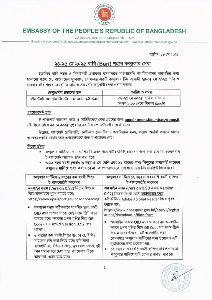 L’Ambasciata del Bangladesh in Italia ha pubblicato un comunicato stampa sui requisiti per richiedere il passaporto. Per i bambini sarà necessario un certificato di registrazione della nascita rilasciato dal comune di residenza e un certificato di registrazione della nascita rilasciato dal Bangladesh. Saranno richieste fotocopie dei passaporti dei genitori. I servizi dell’ambasciata saranno disponibili nella provincia di Bari nei giorni 24 e 25 maggio. L’Ambasciata italiana ha chiesto a tutti di registrare personalmente i propri figli per il passaporto.