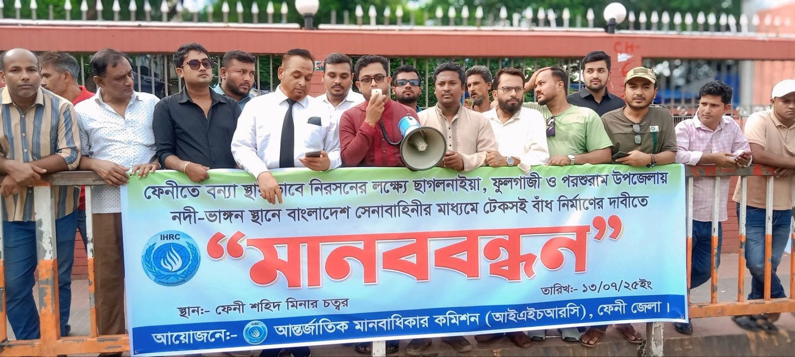 ফেনীতে বাংলাদেশ সেনাবাহিনীর মাধ্যমে টেকসই বাঁধ নির্মাণের দাবিতে মানববন্ধন কর্মসূচি অনুষ্ঠিত হয়েছে। আজ রোববার বিকেলে ৩টা ৩০ মিনিটের সময় শহরের কেন্দ্রীয় শহীদ মিনার চত্বরে আন্তর্জাতিক মানবাধিকার কমিশন (আইএইচআরসি), ফেনী জেলার উদ্যোগে আয়োজিত মানববন্ধন কর্মসূচিতে সভাপতিত্ব করেন সংগঠনের জেলার সমন্বয়ক অ্যাডভোকেট শাহাজালাল ভূঁইয়া সবুজ। আন্তর্জাতিক মানবাধিকার কমিশন ছাগলনাইয়া উপজেলার আহ্বায়ক রফিক আলীর সঞ্চালনায় আয়োজিত মানববন্ধনে প্রধান অতিথির বক্তব্য রাখেন- জেলা জাতীয়তাবাদী আইনজীবী ফোরামের সভাপতি অ্যাডভোকেট মোঃ ফরিদ উদ্দিন খাঁন নয়ন। জেলা ফারিয়া’র সদস্য সচিব খুরশিদ আলম, ছাগলনাইয়া যুবদলের যুগ্ম আহ্বায়ক জামাল উদ্দিন গাজী, শিক্ষানবিশ আইনজীবী আনোয়ার, আইএইচআরসি ছাগলনাইয়া উপজেলার সদস্য সচিব শেখ আবু সালে মাসুম পাটোয়ারী ও ছাগলনাইয়া আইএইচআরসি’র সিঃ যুগ্ম আহ্বায়ক- একরামুল হক রানা। এ সময় জেলা জাতীয়তাবাদী আইনজীবী ফোরামের সভাপতি অ্যাডভোকেট মোঃ ফরিদ উদ্দিন নয়ন বলেন- বিগত সময়ে শহরের পাগলিছড়া খাল দখল করে ফেনী পৌরসভা মার্কেট নির্মাণ করায় শহরে স্থায়ীভাবে জলাবদ্ধতা সৃষ্টি হয়। এবারের বন্যার জন্য দায়ী বাঁধ নির্মাণের ঠিকাদারসহ সংশ্লিষ্ট ব্যক্তিদের শাস্তির আওতায় আনা, বল্লামুখা বাঁধ নির্মান ও মুছাপুর ক্লোজার পুনঃনির্মাণের পাশাপাশি বাঁধ সংরক্ষণের কার্যকর ব্যবস্থা নেওয়ার জন্য তিনি জোর দাবি জানান। অনতিবিলম্বে সরকার যদি আমাদের দাবিসমূহ মেনে না নেয় তবে আমরা রাস্তায় দাঁড়াতে বাধ্য হবো।অ্যাড. শাহজালাল ভুঁইয়া সবুজ বলেন- ২০২৪ সালের আগষ্ট মাসে ফেনীতে এক ভয়াবহ বন্যা হয়েছে। উক্ত ভয়াবহ বন্যায় ফেনীর মানুষ আর্থিকভাবে অপূরণীয় ক্ষতির সম্মুখীন হয়েছে। বন্যায় শত শত ঘরবাড়ী বিলিন হয়েছে এবং ৩০ জনের মত মানুষ মৃত্যু বরণ করেছে। নাগরিক হিসেবে তারা বেঁচে থাকার যে অধিকার ছিলো, স্বাভাবিক ভাবে জীবন যাপন করার যে অধিকার ছিলো। বন্যার কারণে ফেনীর মানুষ সে অধিকার থেকে বঞ্চিত হয়েছে। রাষ্ট্রের উচিত ছিলো গত বছরের ২৪ সালের বন্যার পর নদী ভাঙ্গন স্থানে টেকসই বাঁধ নির্মাণ করা। কিন্তু অন্তর্বর্তীকালীন সরকার কার্যত কোন উদ্যোগ গ্রহণ করতে আমরা দেখিনি। এটা সত্যি দুঃখজনক। তিনি অন্তর্বর্তীকালীন সরকারের নিকট ফেনীতে বন্যা স্থায়ীভাবে নিরসনের লক্ষ্যে বাংলাদেশ সেনাবাহিনীর মাধ্যমে টেকসই বাঁধ নির্মাণের জন্য জোর দাবী জানান। অন্যথায় ফেনীবাসীকে সাথে নিয়ে পানি উন্নয়ন বোর্ড ঘেরাও কর্মসূচি দিতে বাধ্য হবেন বলে জানান।উক্ত মানববন্ধনে উপস্থিত ছিলেন- যুগ্ম আহ্বায়ক মোশাররফ হোসেন, যুগ্ম আহ্বায়ক- ইফতেখার হোসেন, যুগ্ম আহবায়ক- মোঃ আল জোবায়ে